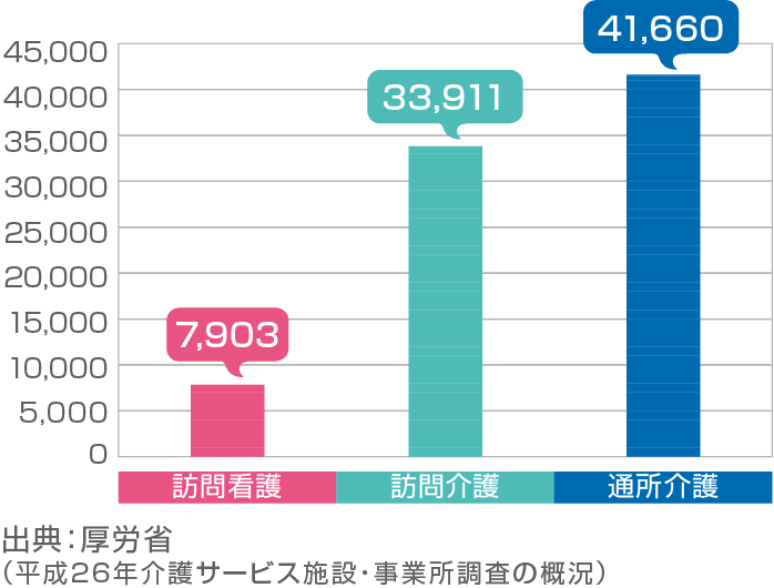 訪問看護ステーション数は、訪問介護、通所介護の事業所数と比較した場合、その数は未だ5分の1、4分の1の事業所数しかなく、需要に供給が追いついていない状況です。
